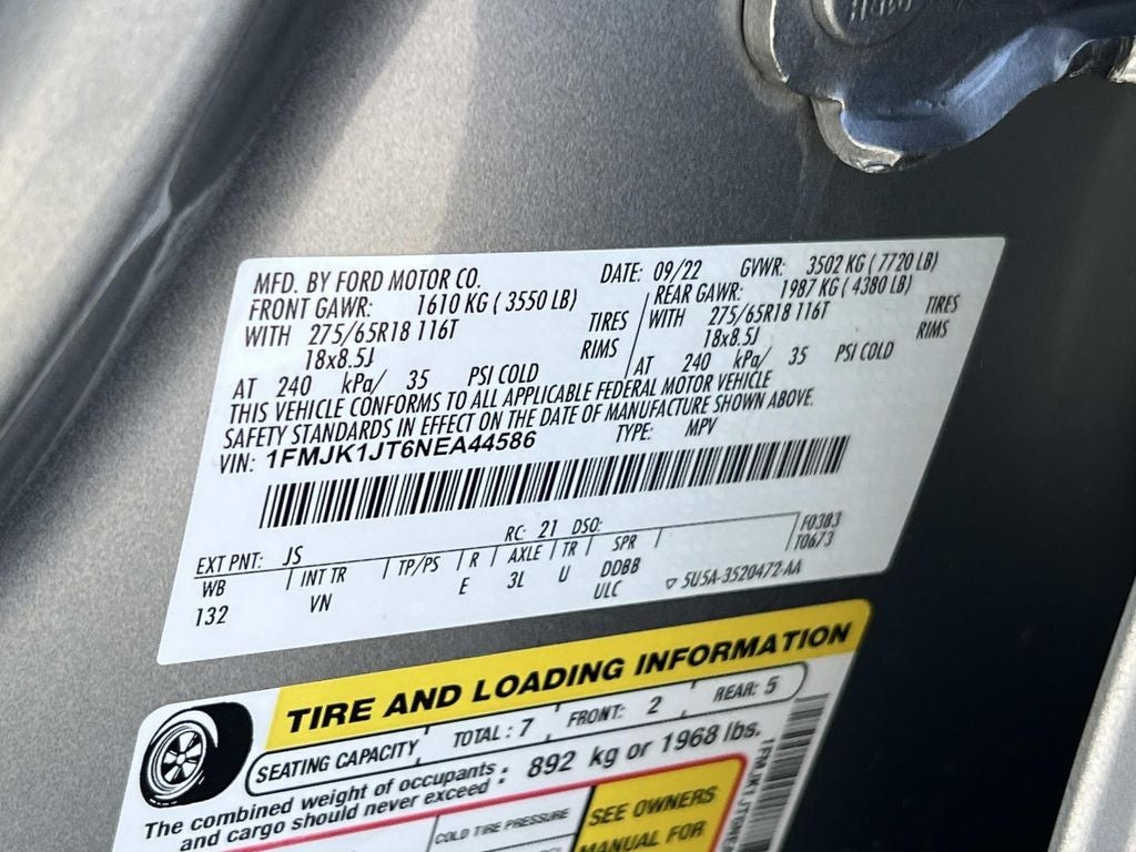 One Owner, Leather, Heated/Cooled Seats, 110V/150W AC Power Outlet, 2nd Row Power-Folding Captain's Chairs, 3.73 Axle Ratio, 3rd Row Vinyl Power-Folding Head Restraints, 4-Door Intelligent Access (Lock/Unlock), Accent Color Painted Rear Bumper, ActiveX-Trimmed 1st & 2nd Row Seats, Advanced Security Pack, Ambient Lighting, Bright Chrome Plated Accent Platform Running Boards, Equipment Group 202A High Package, Heated Steering Wheel, Heated/Ventilated Front Seats, Heavy-Duty Trailer Tow Package, Integrated Trailer Brake Controller, Navigation system: Connected Navigation, Power Liftgate, Power Tilt/Telescopic Steering Wheel w/Memory, Power-Adjustable Pedals w/Memory, Power-Folding Sideview Mirrors w/Autofold, Pro Trailer Backup Assist, Rear View Digital Camera, Remote Start, Reverse Brake Assist, SecuriCode Keyless Entry Keypad, Wireless Charging Pad. Equipment Group 202A High Package (110V/150W AC Power Outlet, 2nd Row Power-Folding Captain's Chairs, 3rd Row Vinyl Power-Folding Head Restraints, 4-Door Intelligent Access (Lock/Unlock), Accent Color Painted Rear Bumper, ActiveX-Trimmed 1st & 2nd Row Seats, Advanced Security Pack, Ambient Lighting, Bright Chrome Plated Accent Platform Running Boards, Heated Steering Wheel, Heated/Ventilated Front Seats, Power Liftgate, Power Tilt/Telescopic Steering Wheel w/Memory, Power-Adjustable Pedals w/Memory, Power-Folding Sideview Mirrors w/Autofold, Remote Start, SecuriCode Keyless Entry Keypad, and Wireless Charging Pad), Heavy-Duty Trailer Tow Package (3.73 Axle Ratio, Integrated Trailer Brake Controller, Pro Trailer Backup Assist, Rear View Digital Camera, and Reverse Brake Assist), Navigation system: Connected Navigation, 18 Machined-Face Aluminum Wheels, 3rd row seats: split-bench, 4-Wheel Disc Brakes, 6 Speakers, ABS brakes, Air Conditioning, Alloy wheels, AM/FM radio: SiriusXM with 360L, Auto High-beam Headlights, Auto Start-Stop Removal, Auto-dimming Rear-View mirror, Automatic temperature control, Black Roof-Rail Crossbars, Brake assist, Bumpers: body-color, Cloth Front Captain's Chairs, Compass, Delay-off headlights, Driver door bin, Driver vanity mirror, Dual front impact airbags, Dual front side impact airbags, Electronic Stability Control, Emergency communication system: SYNC 4 911 Assist, Exterior Parking Camera Rear, Four wheel independent suspension, Front anti-roll bar, Front Bucket Seats, Front Center Armrest, Front dual zone A/C, Front reading lights, Fully automatic headlights, Garage door transmitter, Heated door mirrors, Illuminated entry, Leather steering wheel, Low tire pressure warning, Occupant sensing airbag, Outside temperature display, Overhead airbag, Overhead console, Panic alarm, Passenger door bin, Passenger vanity mirror, Power door mirrors, Power driver seat, Power steering, Power windows, Radio data system, Radio: AM/FM Stereo w/MP3 Capable, Rear air conditioning, Rear anti-roll bar, Rear reading lights, Rear window defroster, Rear window wiper, Reclining 3rd row seat, Remote keyless entry, Security system, SiriusXM w/360L, Speed control, Speed-sensing steering, Speed-Sensitive Wipers, Split folding rear seat, Spoiler, Steering wheel mounted audio controls, SYNC 4 w/Enhanced Voice Recognition, Tachometer, Telescoping steering wheel, Tilt steering wheel, Traction control, Trip computer, Variably intermittent wipers, and Voltmeter.